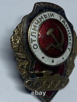 Le badge est une médaille qui commémore les réalisations d'un tankiste soviétique pendant la Seconde Guerre mondiale. Le design est complexe et unique, featuring le symbole emblématique du marteau et de la faucille, ainsi que d'autres insignes militaires. Le badge est en excellent état, sans dommages ni usure. C'est une pièce originale et, en tant que telle, elle constitue un ajout précieux à toute collection.